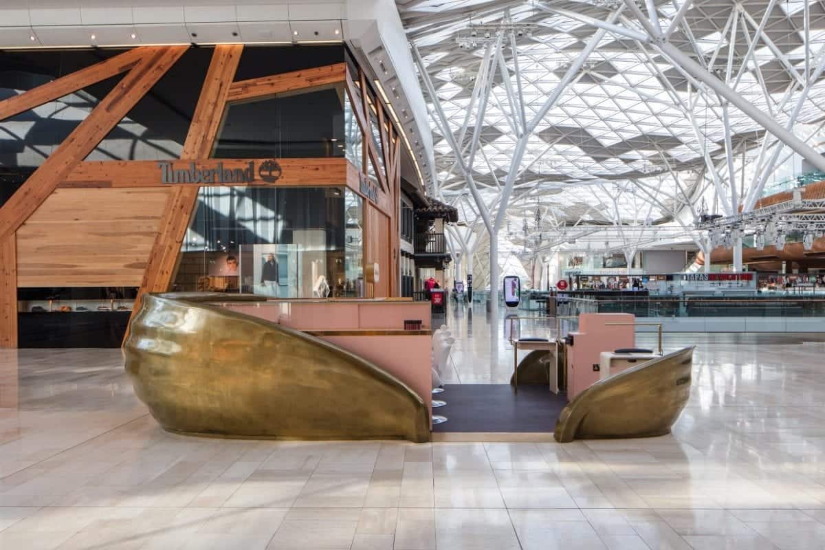 A brass shell-like beauty bar has been unveiled a the entrance to Westfield London.